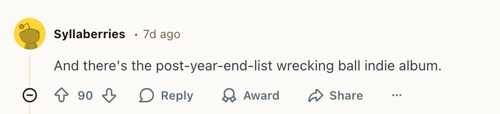 Do you like Bon Iver’s self-titled? How about Black Country, New Road’s Ants From Up There? Still think often about how it felt hearing early Modest Mouse or Funeral by Arcade Fire for the first time? Did you spend your 2025 Getting Killed?
